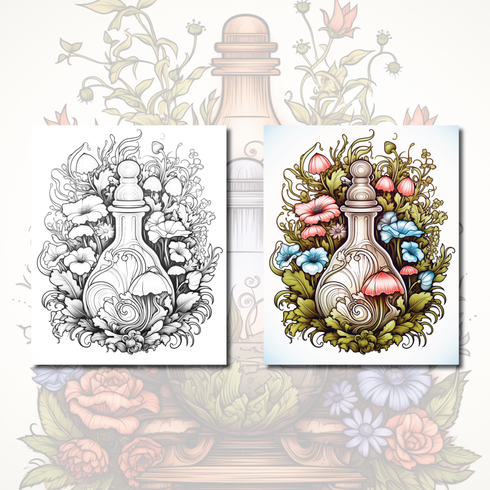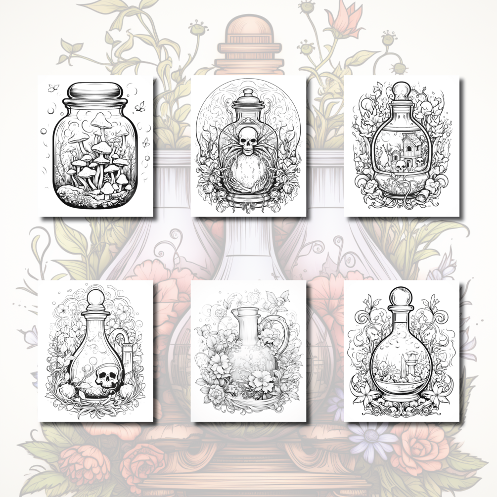 Unleash your creativity as you breathe life into these magic potion coloring pages! Each page boasts a finely detailed greyscale image, adding depth and dimension to your coloring.